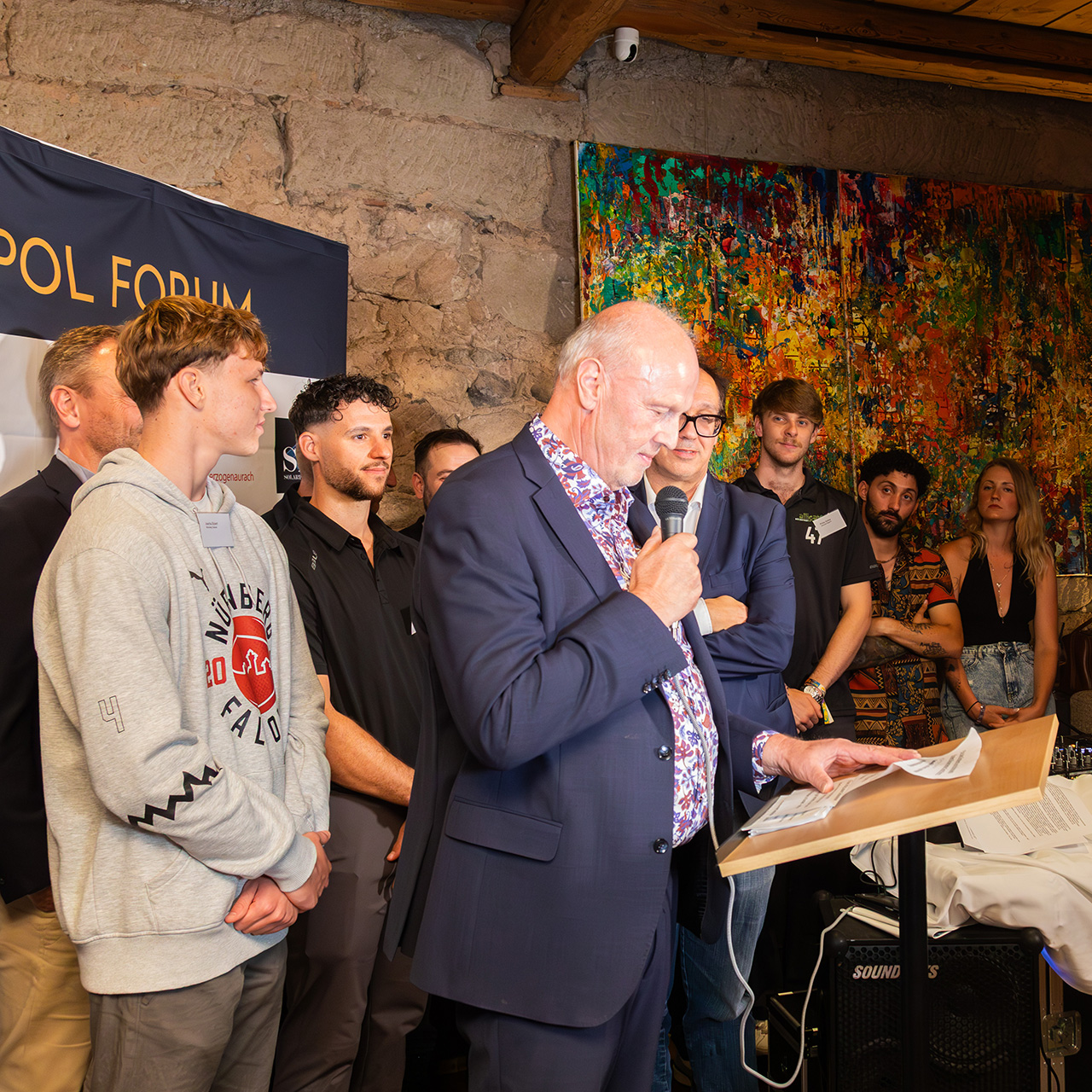 Diesmal stand der Sport im Mittelpunkt der Veranstaltung: So gab es einen interessanten Live-Talk mit Axel Rogner, Ehrenpräsident und 1. Vorsitzender des Verwaltungsrats des höchstklassigen Sportvereins im Landkreis Erlangen-Höchstadt, den Höchstadt Alligators / Höchstadter EC 93 e. V. (Oberliga Süd, dritthöchste Spielklasse im deutschen Eishockey), sowie mit Philipp Stobbe und Dennis Swinnen zwei Profis aus dem aktuellen Mannschaftskader. Ihm gegenüber stand Ralph Junge, Geschäftsführer der Nürnberg Falcons BC GmbH, ebenfalls begleitet von zwei Akteuren (Christian Feneberg und Joscha Eckert) aus dem derzeitigen Team des beliebten Basketball-Zweitligisten aus der Frankenmetropole.